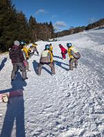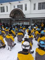 スキー・スノーボード教室2日目です。朝食を終え、レッスンの準備に向かいます。朝の会では各部より前日の反省や本日の確認を全体で行いました。