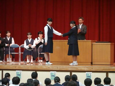 生徒会本部役員選挙が先日行われました。それによって選出された生徒会長や副会長、本部役員の任命及び引継ぎ式が行われました。最後は、新旧の生徒会長による握手が行われました。これからの寄居中学校をより良くしていってください。