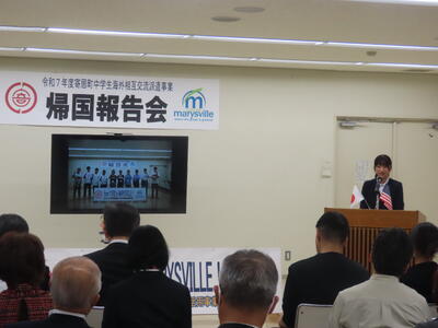 夏休み中にアメリカへ海外相互交流派遣事業で訪問した生徒が寄居町役場で町長や町議員の方などが出席する中で帰国報告会を実施しました。報告では、現地に行ったことによって気付くことやできたことなどが発表され、今までと見方が変わったとの発言も見られました。