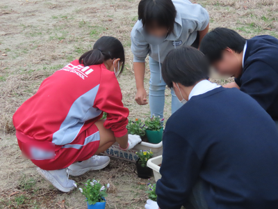 隣接する3校の桜沢小学校と寄居城北高校、本校の3校合同で花植えを実施しました。花植えをしたプランターは、末野郵便局や桜沢郵便局、用土郵便局、寄居郵便局へも運ばれ、きれいな花を咲かせてくれます。