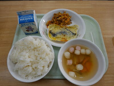 明日のひな祭りに向けて、給食がひな祭り献立でした。献立は、酢飯、紅白すまし汁、ちらし寿司の具、さわらのマヨネーズ焼き、牛乳でした。